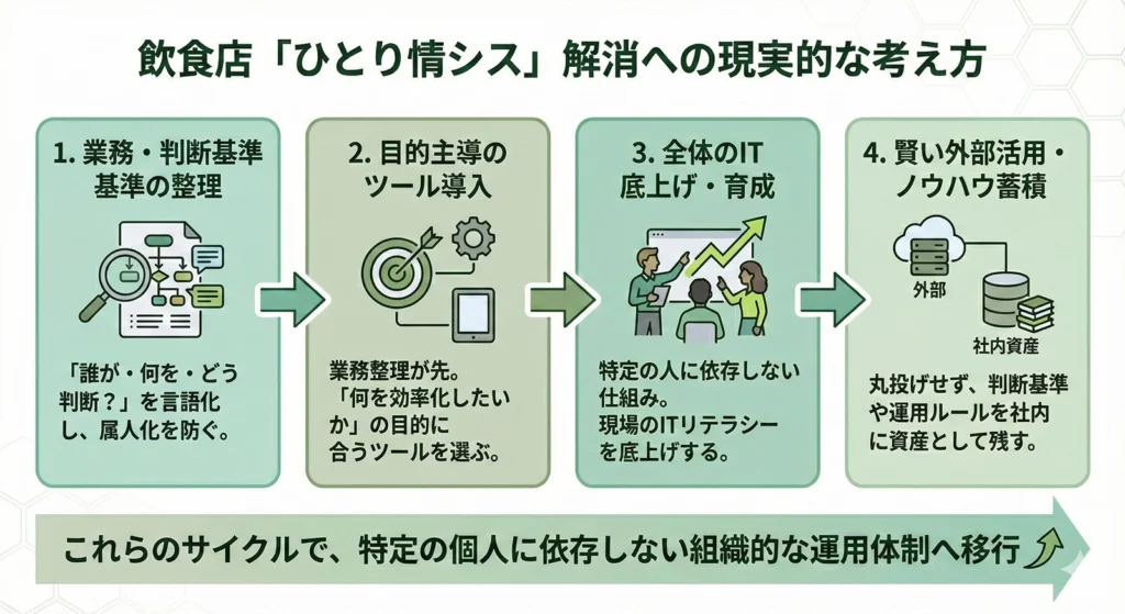 飲食店の「ひとり情シス」問題を解消するために、業務整理からツール導入、人材育成、外部活用までをどのような考え方で進めるべきかを整理します。
