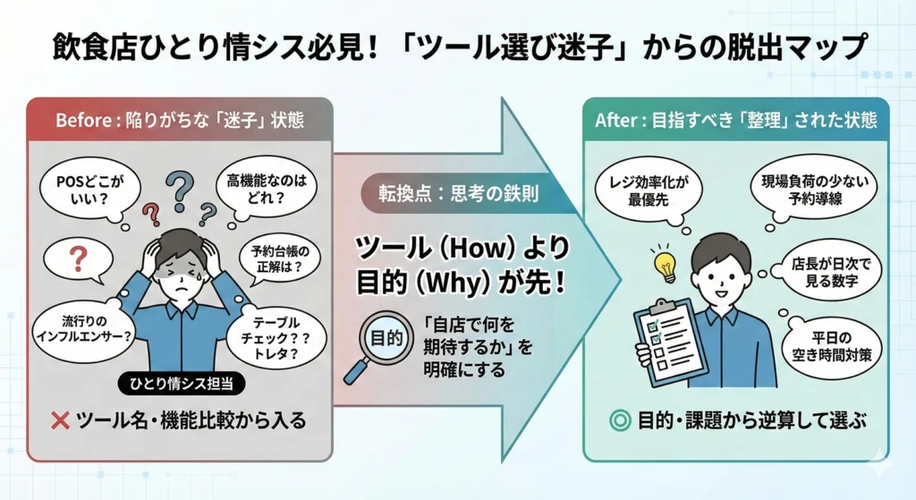 飲食店のひとり情シスでは、POSや予約台帳、集客施策の判断が一人に集中しやすく、「どのツールが良いか」という比較から考え始めて迷子になりがちです。本来は機能比較ではなく、目的や課題から整理することが重要です。ここでは、現場でよく起こるツール選定の迷い方を整理します。